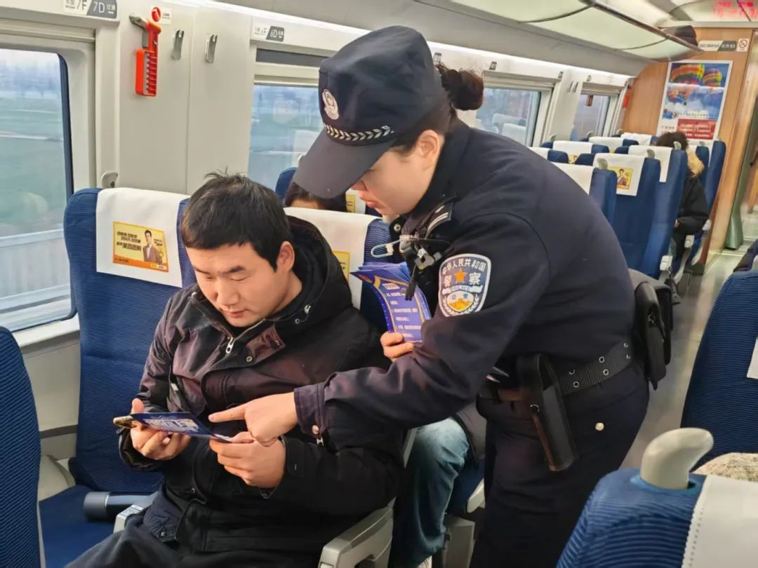 春运期间人员流动频繁,电信诈骗风险也随之增加。为守护返乡旅客的财产安全,郑州乘警支队执勤乘务三队以“精准、敏感、多元”的宣防策略,开展反诈宣传。