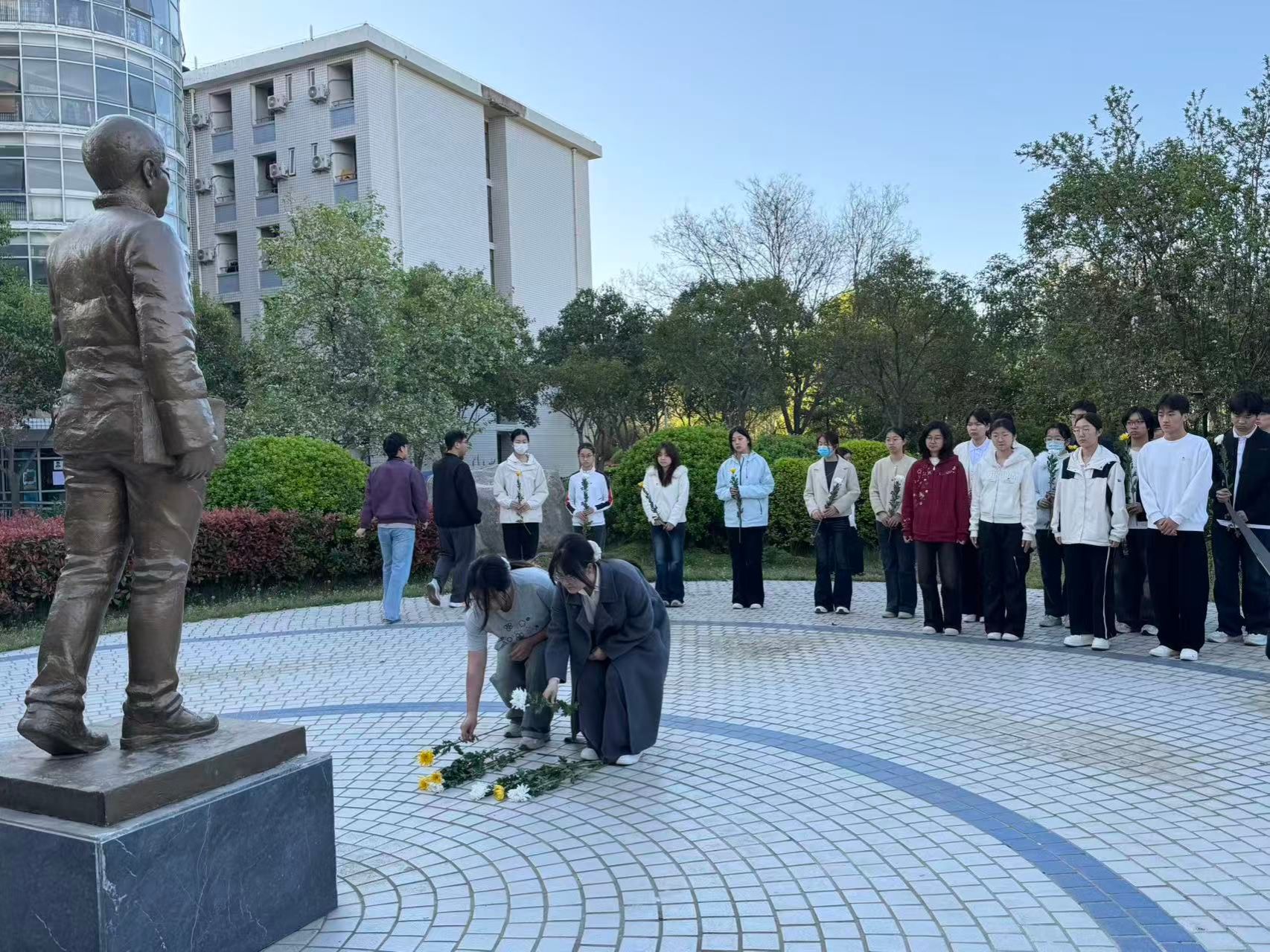 升旗仪式结束后,学生代表前往孟瑞鹏广场开展献花悼念活动。广场上,学校英雄学子孟瑞鹏烈士的塑像庄严肃穆,学生代表伫立默哀,依次上前敬献鲜花,寄托华水青年对孟瑞鹏学长的无限追思与怀念。